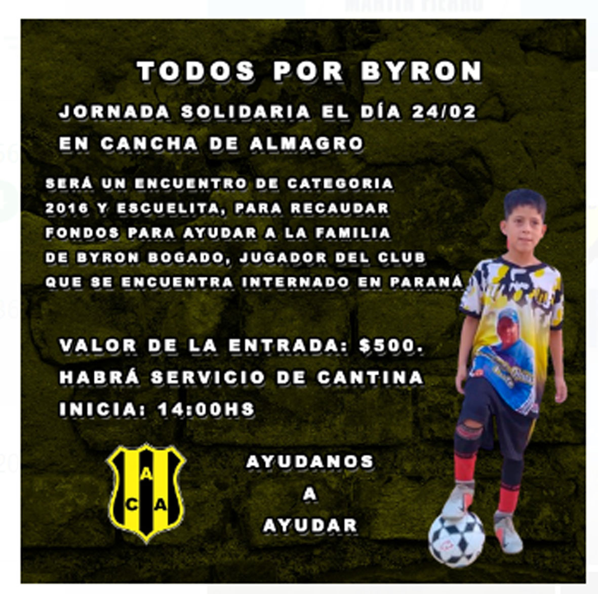 Byron Bogado es un chico que juega en las inferiores de Almagro y que, en estos momentos pasa por una difícil situación. Está internado en la ciudad de Paraná y desde el club de nuestra ciudad han iniciado una campaña para ayudar a la familia del pequeño jugador que tienen muchísimos gastos que paliar.