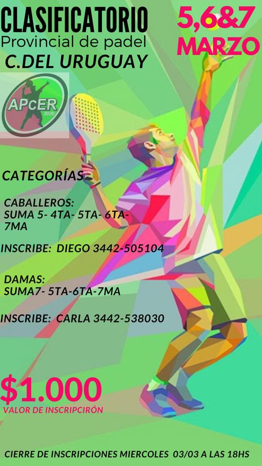 El padel de la Asociación Centro de Entre Ríos (APCER) ya tiene fecha para lo que será su primer clasificatorio del 2021. El mismo se disputará en los complejos de nuestra ciudad desde el viernes 5 hasta el domingo 7 de marzo, con todos los protocolos de seguridad exigidos en estos momentos.