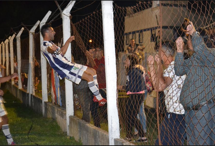 El «Toto» Blanc se trepa al alambrado para festejar su gol, el que abrió el partido final. (Foto Sergio Pilepich).