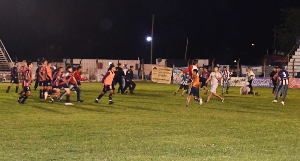 Tras el pitazo final de Gustavo Pérez lo lógico; el festejo de los jugadores de Atlético y la desazón de los de Rivadavia, muchos consolados por sus propios rivales. Todo lo que ocurre tras una final, todo dentro de la normalidad. Hasta que un grupo de hinchas de Atlético, que saltó el alambrado para ir a festejar con los jugadores no tuvo mejor idea que provocar a los hinchas de Rivadavia mostrándole la camiseta y alguna que otra cosa. Algunos hinchas del Trico también se metieron en la cancha para que allí estallara el incidentes que continuó con golpes de puños y patadas, agravándose cuando los jugadores y cuerpo técnico del Tricolor se involucraron también. Fueron algunos minutos de descontrol, golpes y corridas, que por suerte no terminaron en ninguna lesión grave, ya que además comenzaron a arrojarse todo tipo de objetos contundente desde las tribunas. Las manchas que se suman al lomo del fútbol, las cosas que amargan, como también sucediera en la final de 3ª División, con jugadores golpeándose en el final del partido.