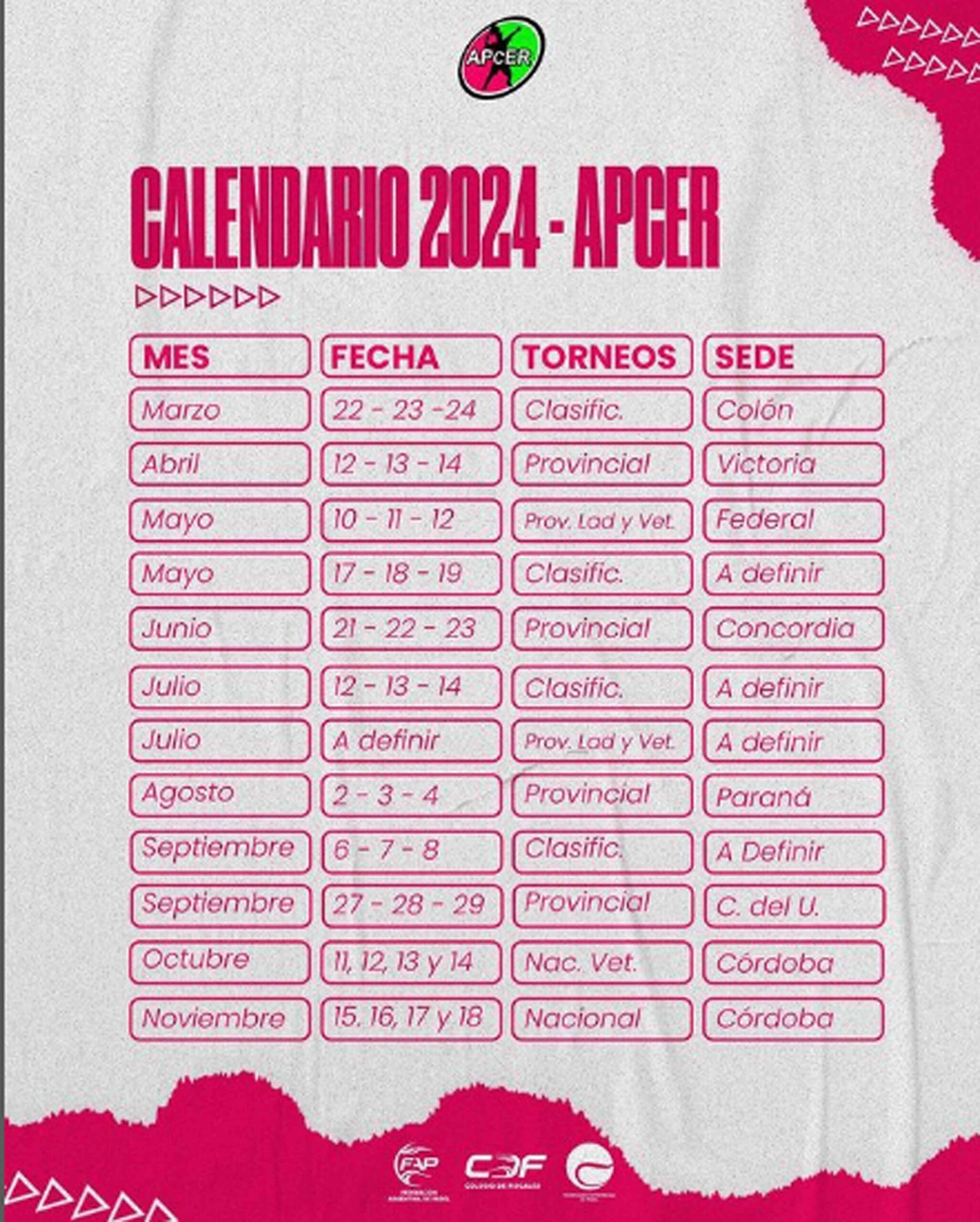 Se están terminando las vacaciones, comienzan las pre temporadas y desde la Asociación de Padel del Centro Entre Ríos (APCER) se dio a conocer el calendario que regirá los destinos del ente que comanda la Federación Entrerriana de Padel (FEP) y sus asociaciones afiliadas.