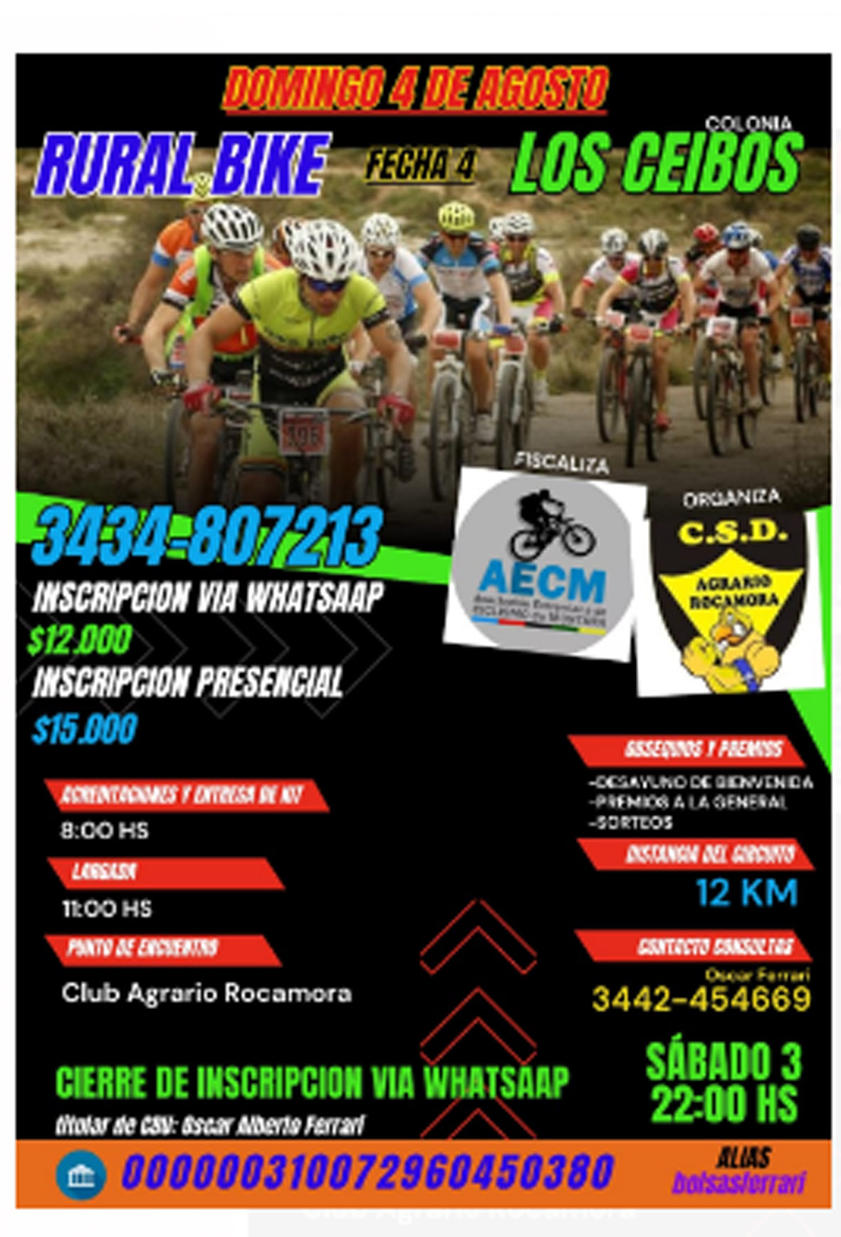 Para aquellos que deseen participar hay dos modos de hacerlo; una vía whatsApp al celular 3442-807213 la que tendrá un costo de $ 12.000. También podrá hacerse en forma presencial el día de la carrera a un costo de $ 15.000. Los que quieran anotarse vía WhatsApp tendrán tiempo hasta el sábado 3 de agosto a las 22:00