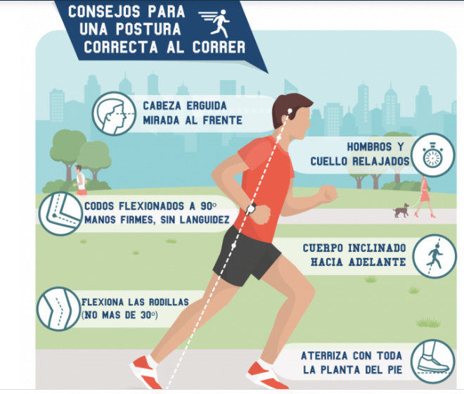 Con una postura adecuada de la espalda conseguirás compensar el movimiento de los brazos y de las piernas de forma correcta. Como mucho puedes inclinarte levemente hacia adelante, pero no demasiado, porque entonces es cuando aparecerá la fatiga.