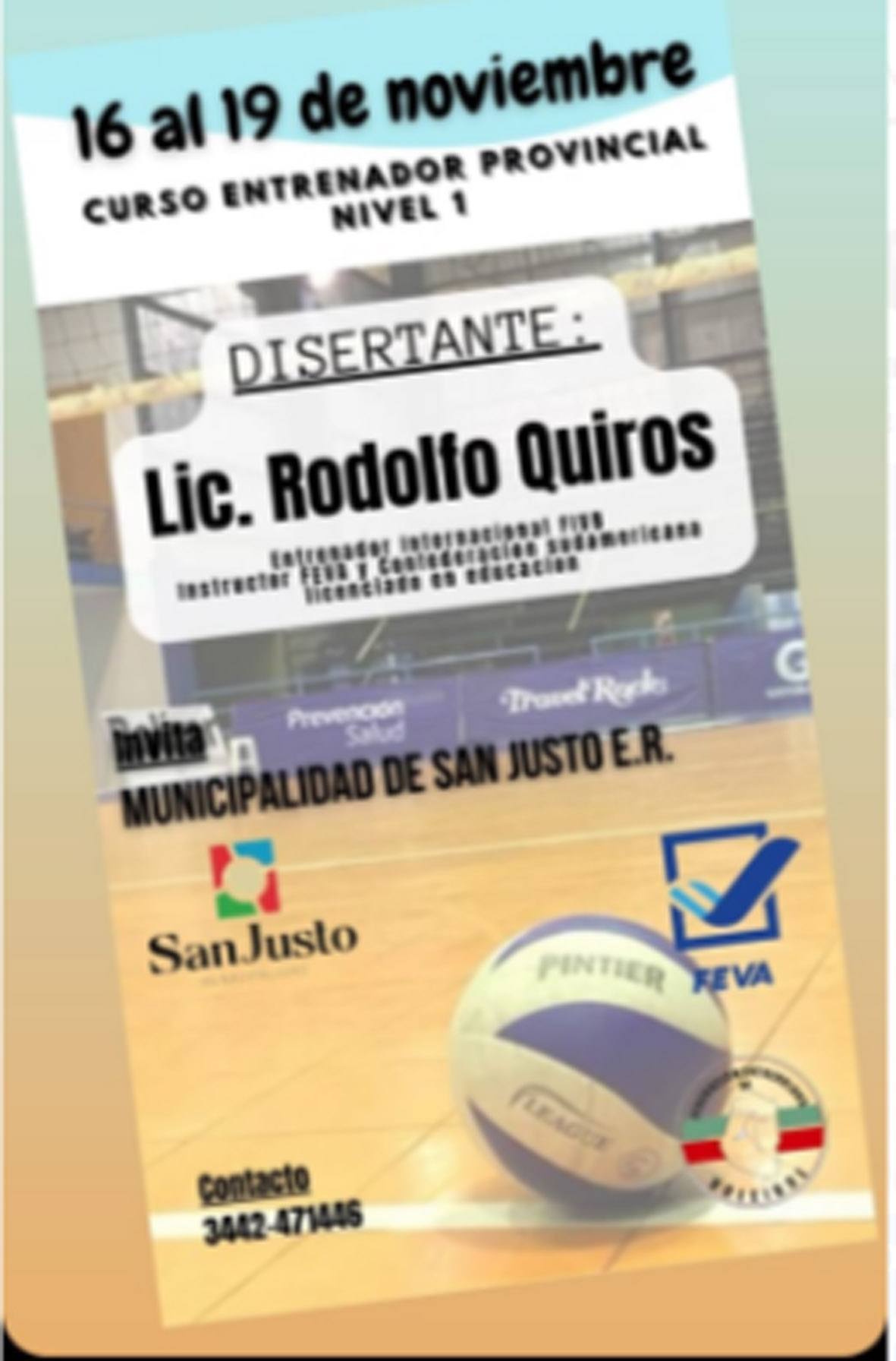 Para todos los aficionados de la zona la Municipalidad de San Justo ha logrado concretar un importante curso que será dictado por Rodolfo Quiroz en el polideportivo de la ciudad. Las gestiones de Gastón Rupani, entrenador de los equipos de San Justo, junto a Mariano Perrón, coordinador deportivo de la localidad; Jorge Torres, secretario de la Federación Entrerriana de Voleivol (FEV) y el aval de la Federación Argentina de Voleibol (FeVA) hicieron posible esto que, anteriormente, sólo se podía realizar viajando a Paraná o Buenos Aires.