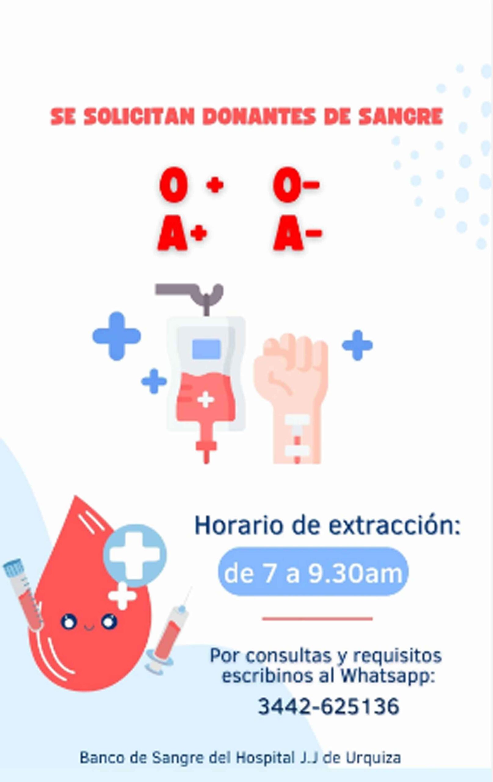 Somos una página exclusivamente deportiva pero no podíamos negarnos a un pedido del Banco de Sangre del Hospital de Zona «Justo José de Urquiza» quien nos mandó un mensaje diciendo que «Queríamos pedirles por favor si podrían ayudarnos con el pedido a la comunidad. Hay mucha demanda de pacientes, necesitamos sangre y hay muy pocos donantes voluntarios! Muchísimas gracias!!!»