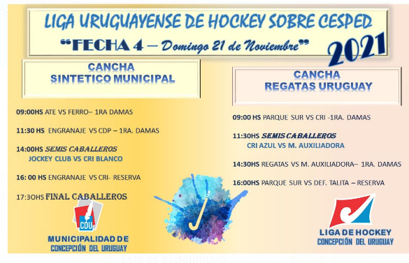 La Liga Uruguayense de Hóckey sobre Césped tendrá este domingo, en los dos sintéticos, la disputa de la cuarta fecha con partidos tanto en damas como en caballeros con la salvedad, que en el torneo de varones, se habrá de definir la competencia.