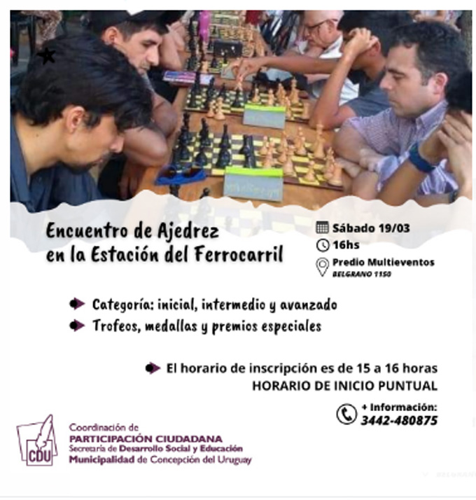 Este sábado en el predio Multieventos de nuestra ciudad (Belgrano 1150) habrá un encuentro de ajedrez a disputarse en la estación del ferrocarril que estará reservado para tres categorías: inicial, intermedio y avanzado.