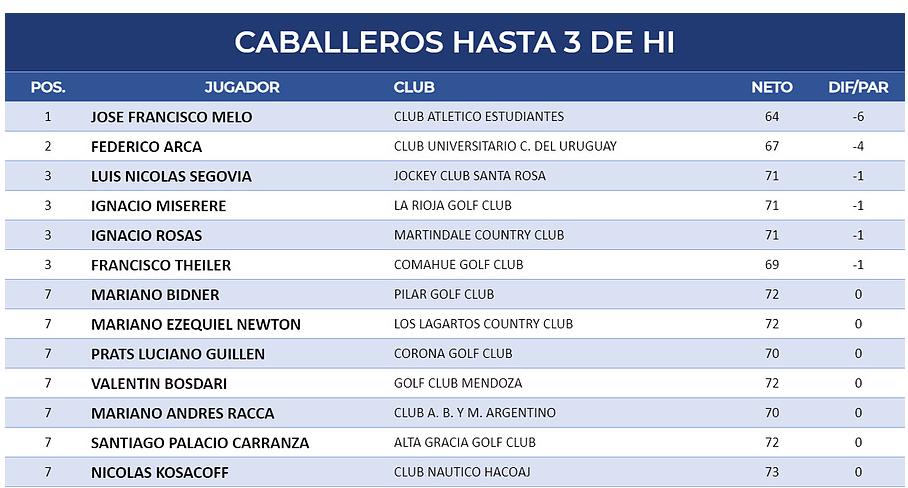 Ahí Federico Arca, en la mejor categoría entre los golfistas amateur del país, hasta 3 de hándicap, terminó segundo cumpliendo una de las mejores labores de un representante del CUCU en los últimos tiempos. Ganó José María Melo del Club Estudiantes de Paraná con 64 golpes. Matías fue segundo con 64 y compartieron el tercer puesto Luis Nicolás Segovia (Jockey Club Santa Rosa), Ignacio Miserere (La Rioja Golf Club) e Ignacio Rosas (Martindale Country Club), todos con 71 golpes.