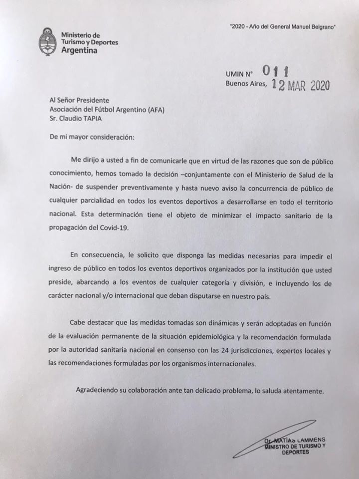En una nota emitida por el Ministerio de Turismo y Deportes conjuntamente con el Ministerio de Salud se resolvió por tiempo indeterminado la prohibición de ingreso de público a todos los eventos futbolísticos disputándose los mismos a puertas cerradas.