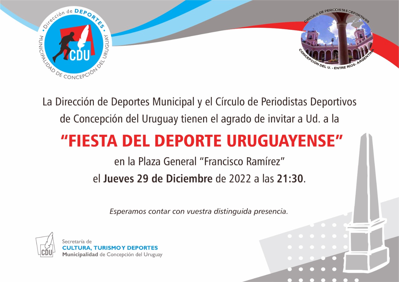 Desde la Dirección de Deportes de la Municipalidad de Concepción del Uruguay y el Círculo de Periodistas Deportivos se ha informado que, el próximo día Jueves 29 de Diciembre, se llevará a cabo la tradicional “Fiesta del Deporte Uruguayense 2022” donde se distinguirán a deportistas destacados en el presente año en 40 disciplinas deportivas.