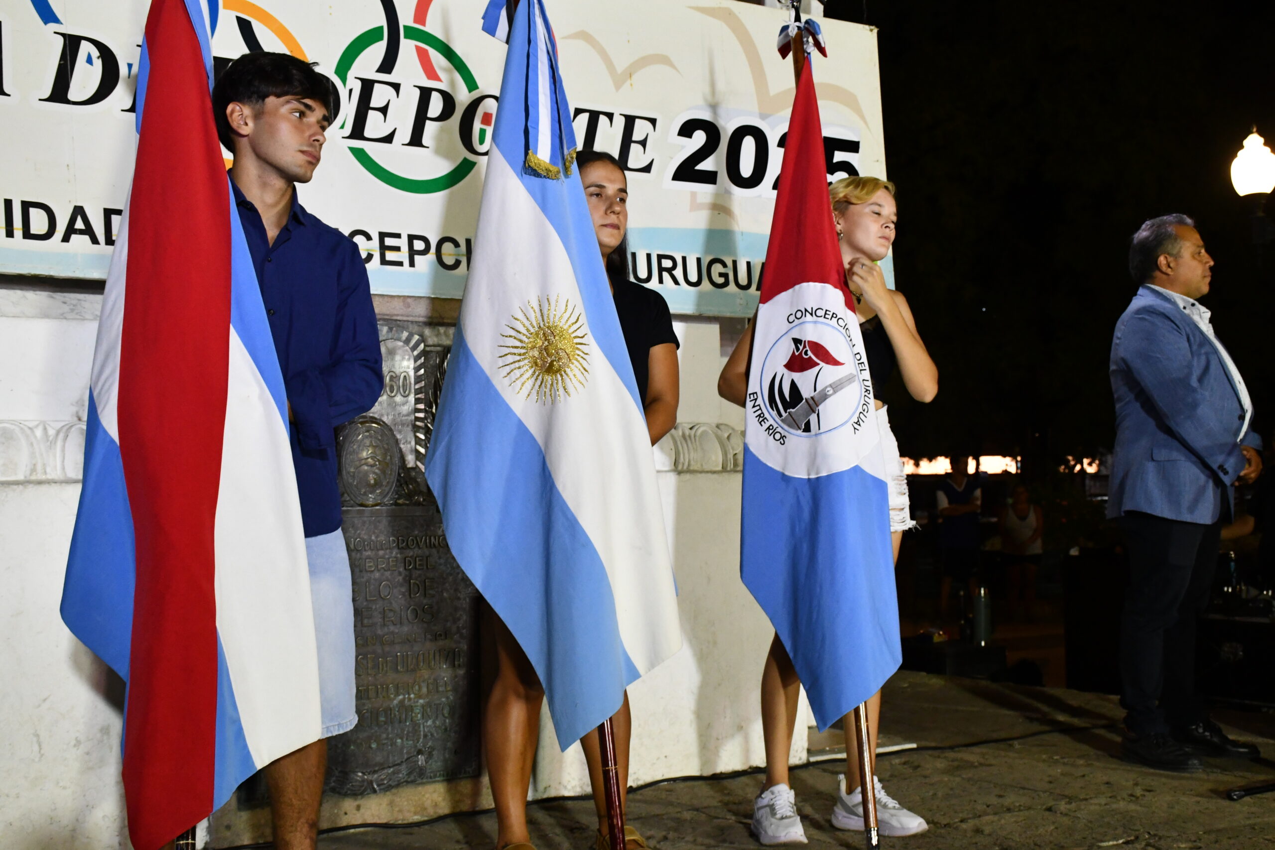 La fiesta, sobriamente dirigida por Diego Alba y Héctor Caffa, comenzó con el ingreso de las banderas de ceremonia que eran portadas por Ivo Reniero, Milagros Victoria Pereyra y Brisa Roldán para luego entonarse el Himno Nacional y el Himno de Entre Ríos.