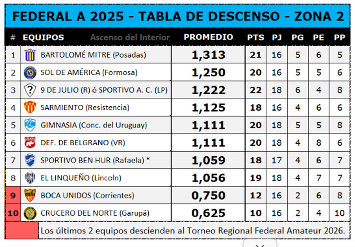 De acuerdo a lo que informa Ascenso del Interior estos serán los promedios con los que arrancan los equipos de las zonas 3 y 4. Queda por dilucidar si Sportivo Las Parejas o 9 de Julio se meten entre los 5 de arriba. Si el Tribunal de Penas actúa de la misma forma que lo hizo en el partido Gimnasia-Douglas Haig, 9 de Julio ganará los puntos ante Ben Hur y será el clasificado. Las Parejas jugará la Reválida. Si se le da por perdido a Ben Hur habrá que acomodar su promedio.