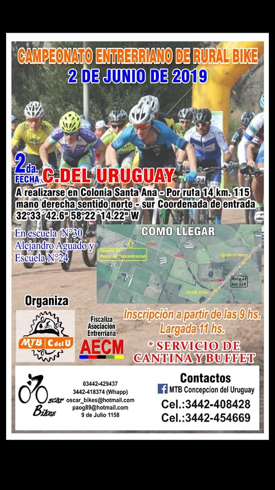 El horario de comienzo de inscripción es a las 9:00 y el de largada a las 11:00. Para mayor información los interesados en participar pueden contactarse a los teléfonos 03442 – 408428 y 03442 – 454669 o al facebook del grupo organizador: MTB Concepción del Uruguay.