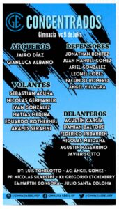 Gimnasia: Jairo Díaz; Leonel López, Jonathan Benítez, Facundo Romero o Juan Manuel Gómez y Ariel González; Damián Baltoré, Sebastián Acuña, Eduardo Rothermel y Nicolás Germanier; Agustín García y Agustín Passarino. DT: Luis Francisco Tonelotto.