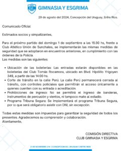 Para este partido regirán las mismas medidas de seguridad que hubo para el partido ante Juventud Antoniana; sin instrumentos de percusión, sin banderas y sin equipos de mates, entre otras restricciones. El informe dado a conocer desde el club es el siguiente: