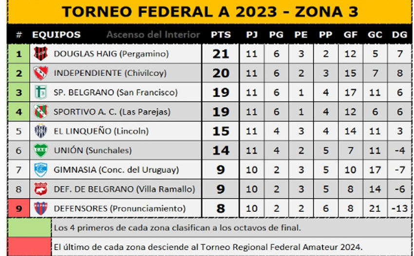 Cumplidas 11 fecha estas son las posiciones en la Zona 3 (Gentileza Ascenso del Interior):