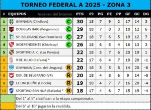 Al terminarse la fase clasificatoria, más allá del partido suspendido, estas son las posiciones de la Zona 3 (gentileza Ascenso del Interior):