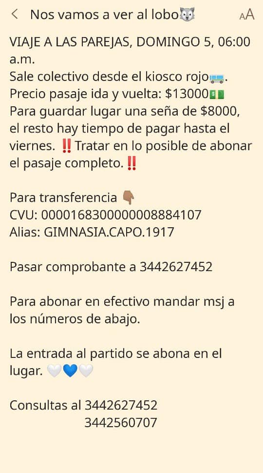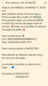 En la foto que acompaña esta nota se dan a conocer más detalles para todos aquellos que deseen acompañar al Lobo.