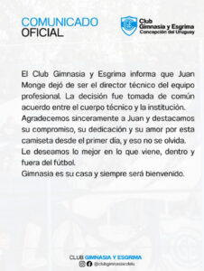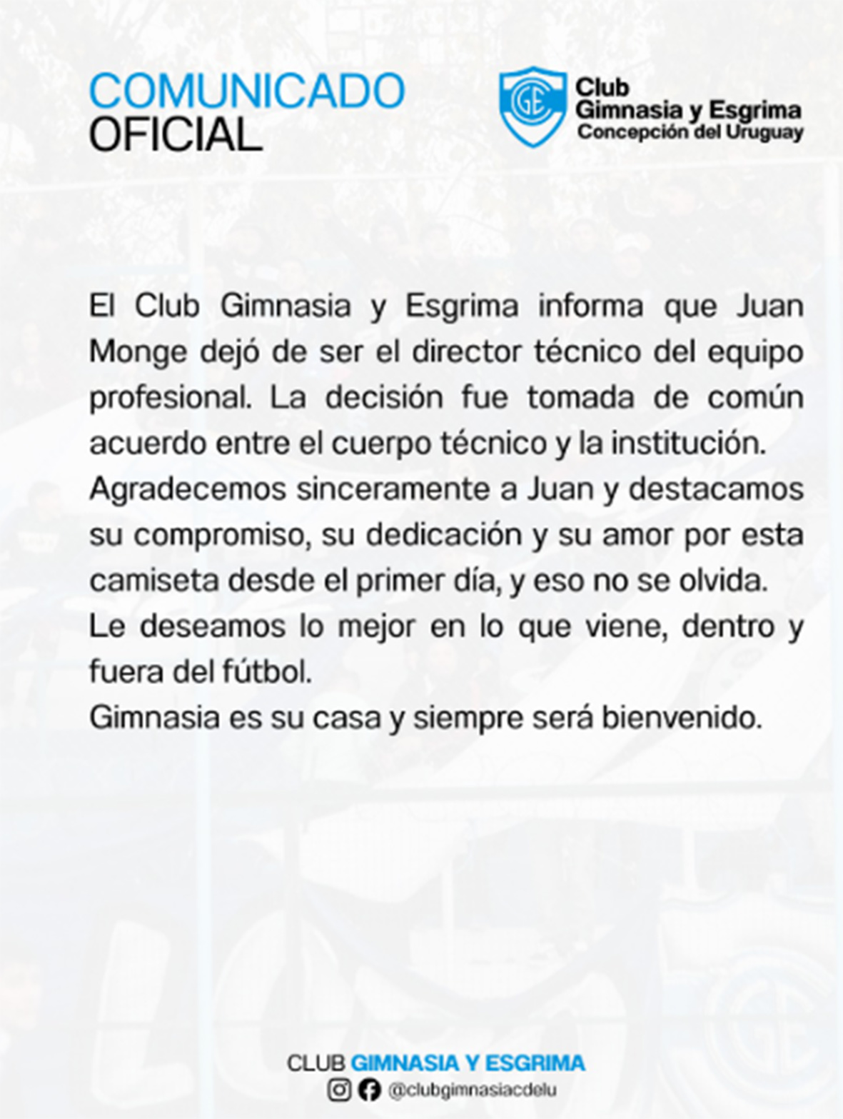 Un breve comunicado tras la derrota ante Escobar FC daba cuenta que Juan Monge había dejado de ser el técnico de Gimnasia y Esgrima y es una lástima que un referente del club se tenga que ir de esa manera, pero son las reglas de nuestro fútbol.