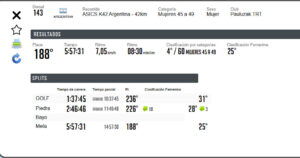 Al final de los 42k Julieta fue 25ª en la clasificación general y 4ª en su categoría de 45 a 49 años lo que la dejó plenamente feliz y, finalmente, pudiendo bajar las 6 horas en el recorrido dado que su tiempo fue de 5:57:31. En su paso por Golf estaba 31ª; cuando pasó por Piedras ya estaba 28ª y cuando llegó a la meta estaba 25ª en la general de mujeres.