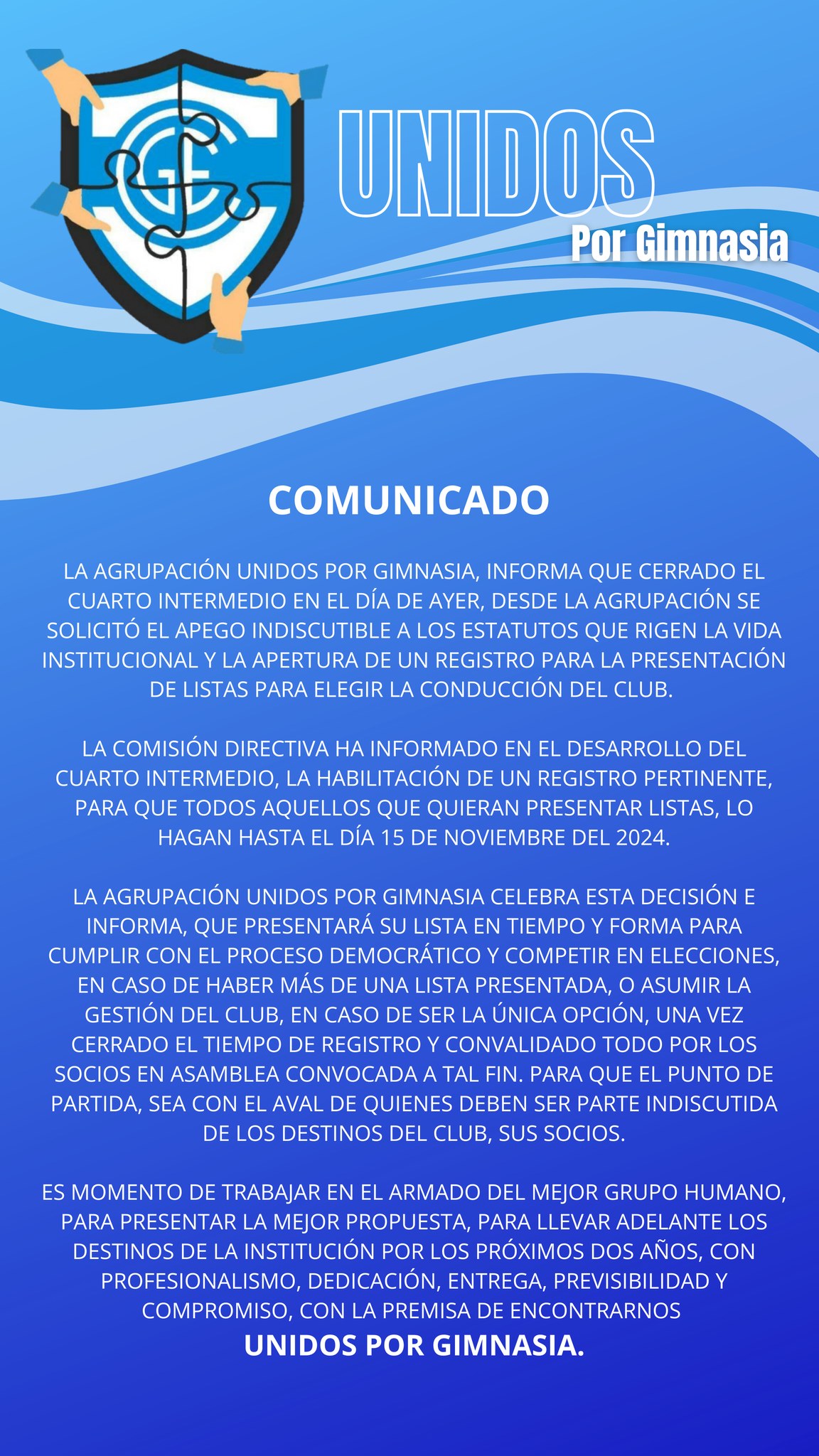 La Agrupación Unidos por Gimnasia, informa que cerrado el cuarto intermedio en el día de ayer, desde la Agrupación se solicitó el apego indiscutible a los estatutos que rigen la vida institucional y la apertura de un registro para la presentación de listas para elegir la conducción del club.