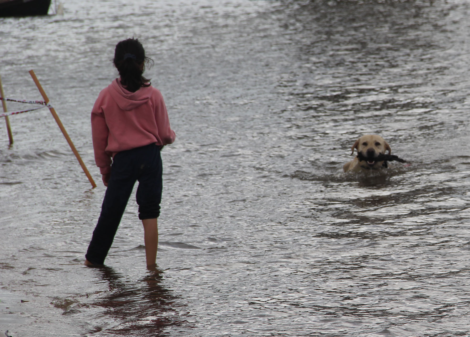 El canotaje de maratón no es demasiado atractivo para los que están presenciando las carreras salvo en esos momentos de acarreo o definiciones de cada una de las pruebas. Después de cada pase hay un momento de poca acción que, este sábado, fue cubierta por Zeus ‘el cable a tierra de Delfina’ nos cuentan desde su círculo familiar y Zeus fue la atracción de esos momentos sin acción en el canotaje. Zeus, un Labrador buenazo, «pidiendo» que le tiren un palo para ir al agua a buscarlo y traerlo para volver a intentar la tarea se llevó las miradas de todos. Eso sí, cada vez que pasaba el K2 de Delfina y Ana había que tenerlo porque si no se iba con ellas. Un personaje Zeus.
