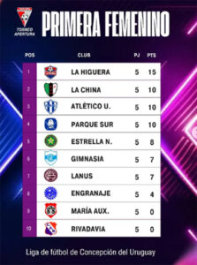 La Higuera goleó a La China y se afianza en el liderazgo del Torneo Apertura donde ahora hay 3 escoltas, La China, Parque Sur y Atlético Uruguay.
