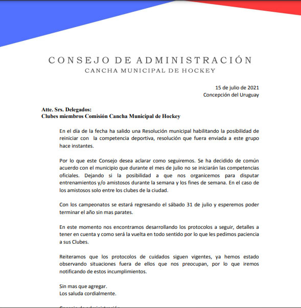 Recordemos que la Liga uruguayense estaba en plena disputa del primer torneo oficial lo que se vio frenado por la pandemia y ahora que se habilitó recibimos el comunicado emitido desde el Consejo de Administración de la Cancha Municipal de Hóckey donde se informa sobre los pasos a seguir.