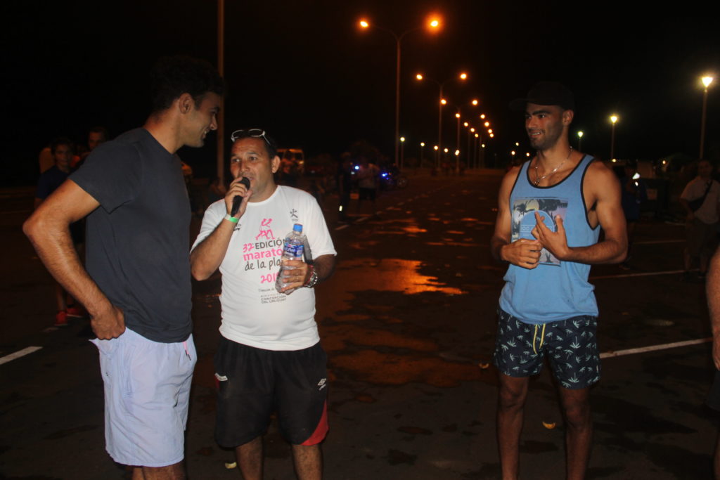 Muy buena la locución de Carlos Lescano. En la foto conversando con los mellis Malaval quienes se acercaron a colaborar con la prueba entregando agua en la hidratación.