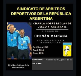 En otro orden de cosas se informó que el viernes próximo el SADRA Entre Ríos presenta al árbitro asistente (Hernán Maidana) con más copas del mundo jugadas en una charla sobre reglamento, arbitraje y fútbol destinada a árbitros, periodistas e interesados. Sera vía zoom el viernes desde las 19:00.