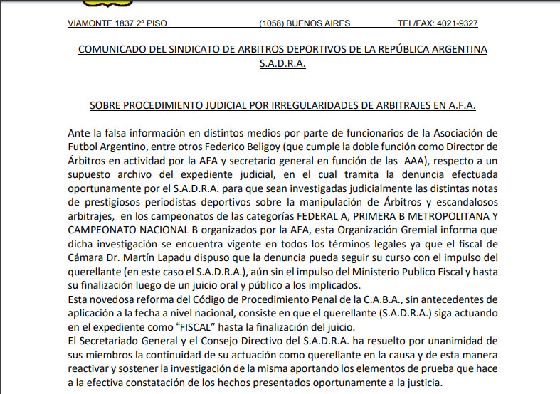 Sostiene la nota que «Hace ya un tiempo se puede observar un conflicto entre la Asociación del Fútbol Argentino (AFA) y el Sindicato de Árbitros Deportivos de la República Argentina (SADRA) que por él parate del fútbol a raíz de la pandemia, todo parecía haberse calmado un poco hasta ahora. Si de algo se la puede encuadrar a la AFA es de negociados en los distintos estamentos dónde tiene campo de acción, uno de ellos es en la parte que concierne a los árbitros.
