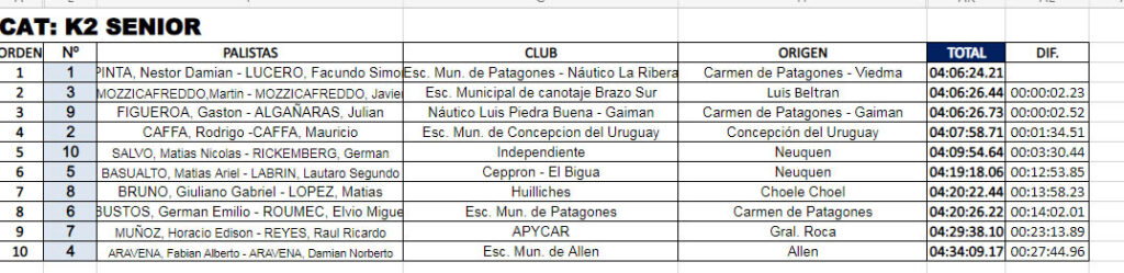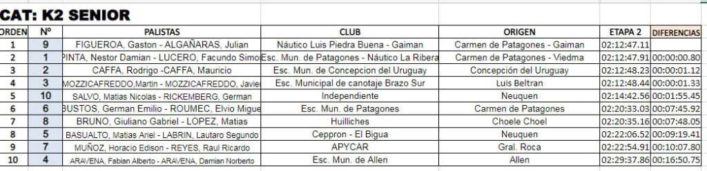 La segunda etapa, en lo que hace a la categoría elite, Seniors K2, fue para los palistas Gastón Figueroa y Julián Algañaras, del club Gaiman y del Náutico Luis Piedra Buena de Patagones, con el bote número 9. Segundos fueron Néstor Damián Pinta y Facundo Lucero quienes mantienen la punta en la clasificación general.