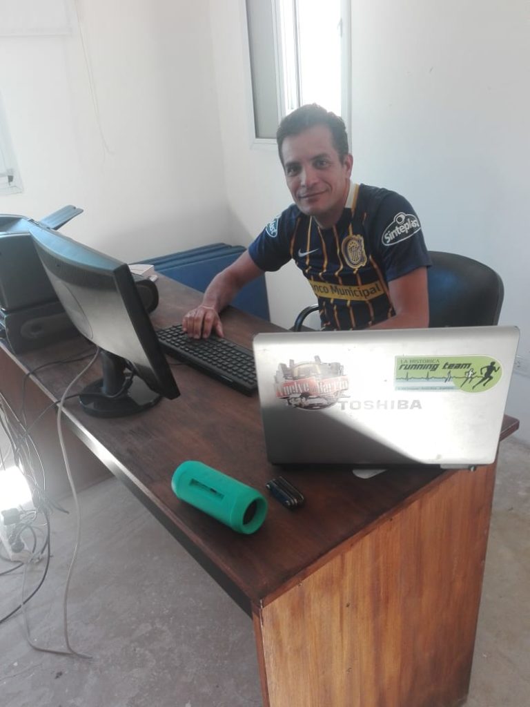Con la casaca del «Canall», Rosario Central, analizando los datos que le mandan sus alumnos.