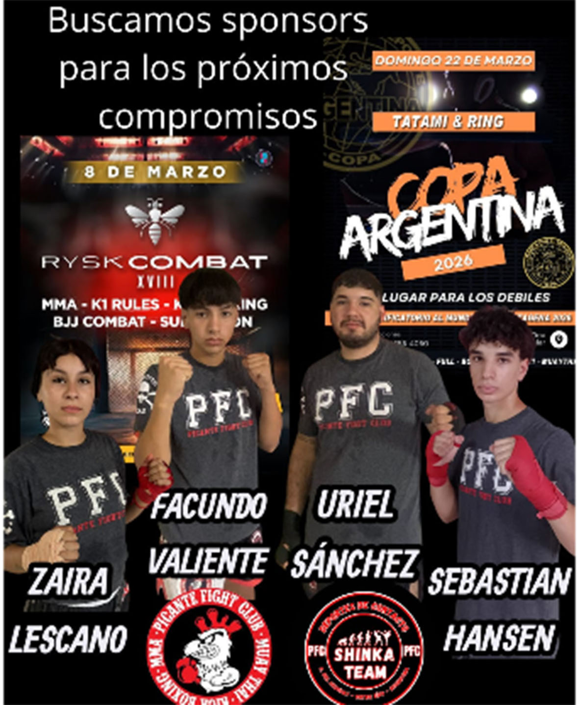 Zaira Lezcano, Facundo Valiente, Uriel Sánchez y Sebastián Hansen son cuatro peleadores del kickboxing que están en la búsqueda de sponsors para los próximos combates que tendrán en el mes de marzo en la ciudad de Buenos Aires.