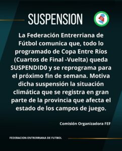 El mal tiempo fue otra vez protagonista y la Copa Entre Ríos «Argentina campeón del mundo» no tendrá este fin de semana a sus finalistas. Desde la Federación Entrerriana e Fútbol (FEF) se informó que se suspenden y serán reprogramado para el próximo fin de semana.