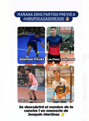Esta noche, en el complejo Puerto Padel de Andrea Olivera, habrá una serie de hechos que habrán de reunir a la familia del padel uruguayense. El primero de ellos es ponerle el nombre de «Joaquín Martínez» a la cancha número uno del complejo en recordación del joven recientemente fallecido y que fuera una de nuestra promesas en el deporte.