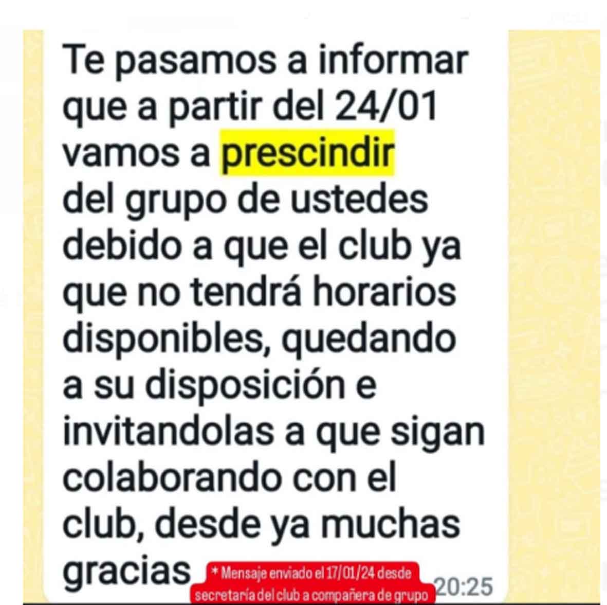 «La Comisión Directiva actual decide “prescindir” de dicho grupo de socias, informándolo por un mensaje de whatsapp con el justificativo de no tener horarios disponibles. Cabe destacar que, este grupo de mujeres presentó una lista para la asamblea realizada en agosto de 2023, y así llevar a cabo la elección de autoridades, la cual no fue posible por la impugnación errónea de dicha lista, que estaba compuesta por mujeres en su totalidad y no cumplía a su (mal) entender con los requisitos de la ley 10844 sobre paridad de género en entidades civiles. (*)