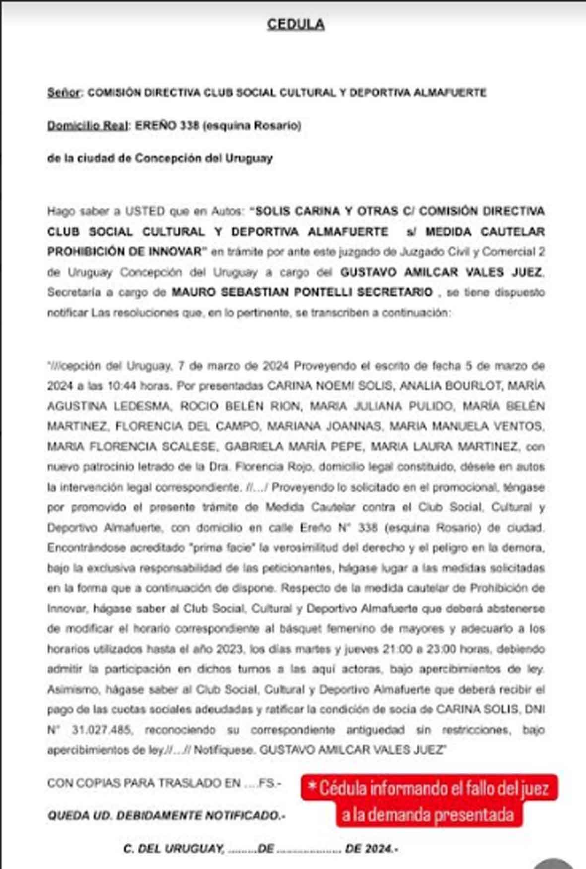 «Desconociendo el motivo del accionar de esta Comisión Directiva, solicitamos ser escuchadas y recuperar nuestro espacio como socias y jugadoras de básquet del Club Social, Cultural y Deportivo Almafuerte». Muchas gracias.