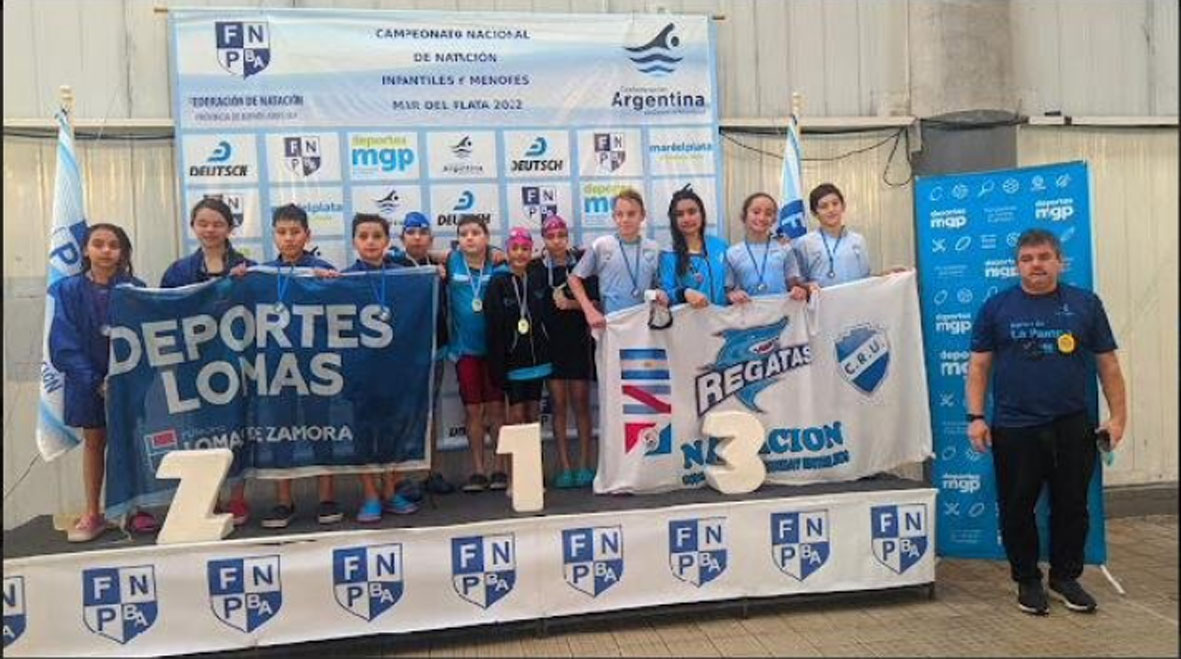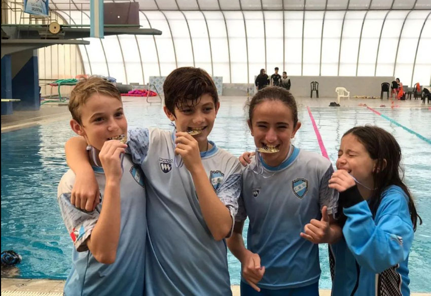Campeones nacionales en la posta 4×50 metros combinados, infantiles 2. Equipo conformado por Segundo Alba, Hanna Pralong, Ignacio Gangge y Clara Ramírez.