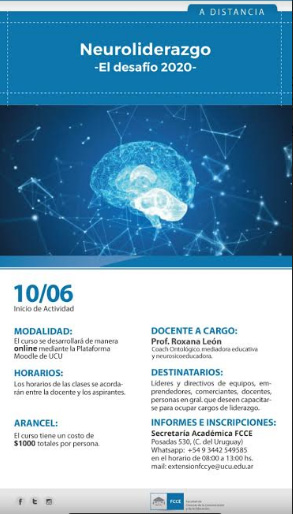 Este miércoles 10 de junio, la profesora y Coach Ontológico Roxana León dará inicio al curso on line “Liderazgo, el desafío 2020”. El mismo está destinado a líderes de equipos, emprendedores, comerciantes, docentes y personas en general que deseen capacitarse para ejercer funciones de Liderazgo desde la óptica de las Neurociencias y el Coaching.