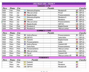 El voleibol uruguayense que cuenta con la participación de otras instituciones de la zona volverá a a tener competencia este fin de semana. Será la 9ª fecha la que se disputará desde las 14:00 de este sábado en el gimnasio «Dr. Alberto René Salem» del CEF Nº 3 «Hugo Mario La Nasa».