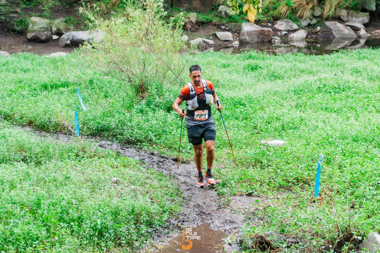 La largada fue a la 4 AM con un clima muy hostil de lluvia muy intensa que complicó, aún más, el terreno que los runners dijeron que “era muy técnico”. Eso fue durante los primeros 20k, después eran dos vueltas de 11k al Dique La Quebrada con partes trabadas de arroyos y bastante agua!