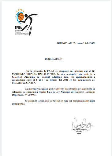 «Por la presente, la FABA se complace en informar que el Sr. Thiago Martínez ha sido designado integrante de la Selección Argentina de Basquetbol Adaptado para los entrenamientos a desarrollarse entre el 8 y el 11 de febrero de 2021 en las instalaciones del CENARD en el CABA.