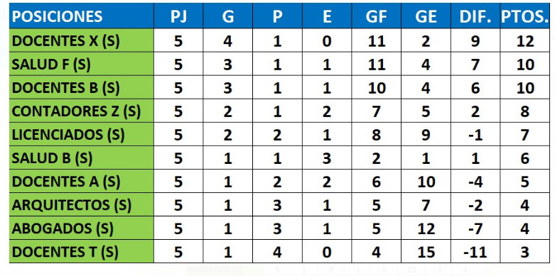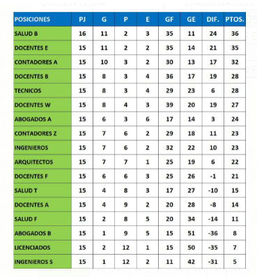 Lidera Salud B con 36 puntos y Docentes E tiene 35 pero, con el dato a favor de la ‘Naranja’ que su rival ya completó su torneo, queda libre en la última y le deja el camino a los E para que, ganando su partido ante los Docentes A, de llegar al título. Se quedaron sin posibilidades ya los triple campeones del 2019, los Contadores A que perdieron en un partidazo ante los Docentes E.