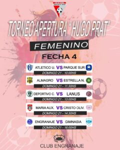 La cancha de Engranaje será el escenario donde, este domingo, se jugará la cuarta fecha del Torneo Apertura «Hugo Prat» en la competencia de fútbol reservado para equipos femeninos.