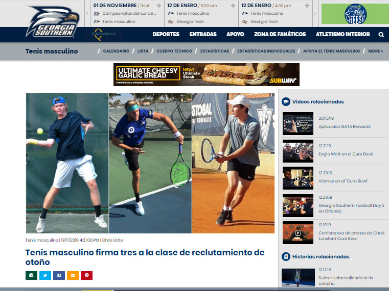 Dice la página que «El equipo de tenis de Georgia Southern Men’s firmó tres atletas el miércoles pasado en el día nacional de firma de otoño, incluidos dos de fuera de los EE. UU. Y uno del estado de Peach. Los tres atletas comenzarán a competir por las Águilas en la temporada de otoño de 2020 y la temporada de primavera de 2021.