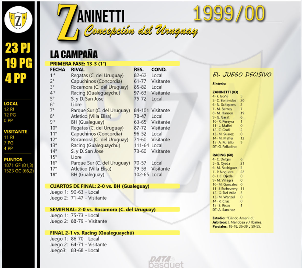 De esta manera se llegó al juego decisivo que se disputó la lluviosa noche del lunes 17 de abril del 2000, en un “Cilindro Amarillo” repleto como nunca antes. Los árbitros designados fueron los experimentados Javier Mendoza y Jorge Ibáñez. El nerviosismo y la tensión fueron un factor influyente para un primer tiempo de trámite parejo que dejó a Racing arriba por 39 a 36. En el complemento mejoró Zaninetti con el poder interior de Fabricio Goñe y Andrés Portillo, la capacidad ofensiva de Carlos Benavidez, quien anotó 20 puntos, bien complementado con los lanzamientos a distancia de Matías Hansen, quien culminó el partido con 19 tantos. Pero el factor decisivo fue Martín Maffei, quien saliendo desde el banco fue clave con 12 puntos y así su equipo comenzó a volcar el partido en su favor. El marcador final fue 83 a 68 y con el pitazo llegó la explosión de alegría de la gente de Zaninetti que disfrutó la consagración de una generación de jugadores nacidos en el club y que dejaron un recuerdo imborrable en la historia de la institución.