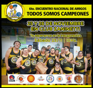 Bajo el nombre de «Todos somos campeones» el próximo fin de semana se realizará, en el club Presbítero Zaninetti, el 6º Encuentro Nacional de Amigos en la disciplina básquetbol inclusivo.